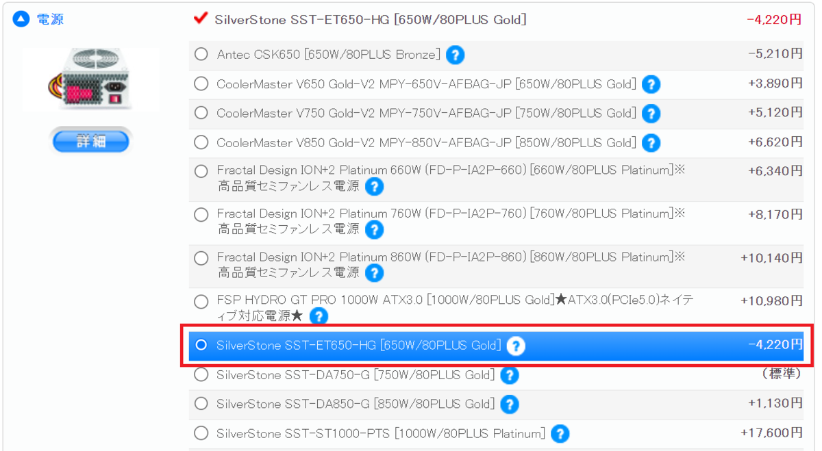逆に、将来のアップグレードを考えていない人なら、650Wの【SilverStone SST-ET650-HG [650W/80PLUS Gold]】にグレードダウンしてもいい。価格は4220円下がり、コスパ重視でカスタムするなら悪くない選択だ。特にビデオカードは標準のGeForce RTX 3060搭載モデルのままで十分だと考えているなら、検討する余地があるだろう。