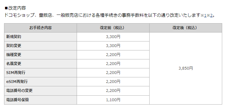 NTTドコモは、ドコモショップ店頭での新規契約や機種変更などの手続きの際の事務手数料を7月1日に改定。3850円へと値上げする。なお、ウェブでの手続き(新規契約や機種変更などは無料)については今回の料金改定の対象外。