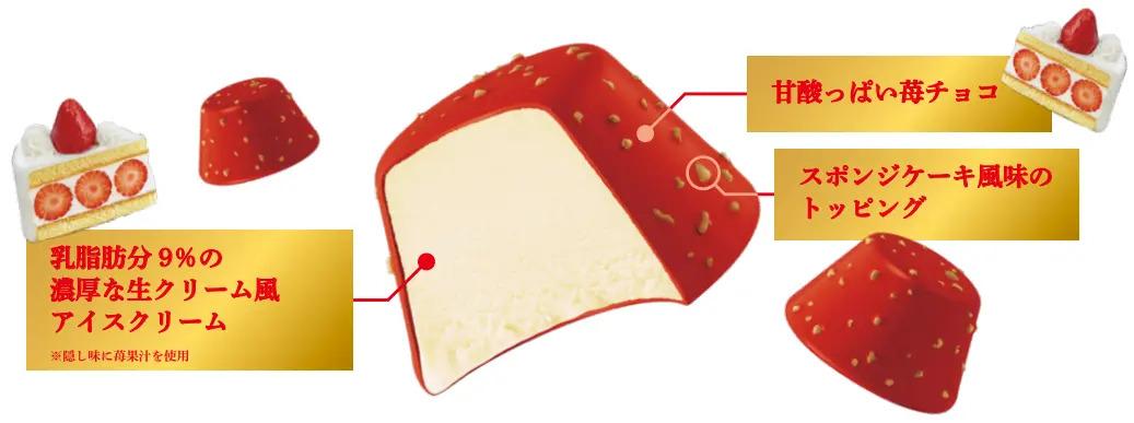 生クリーム風アイスクリームを苺のように甘酸っぱくて鮮やかな赤い苺チョコでコーティングし、さらに苺チョコにはスポンジケーキ風味のトッピングを混ぜ込むことで、苺のショートケーキの再現性が高まり、苺のショートケーキを食べているような食感を楽しめる。