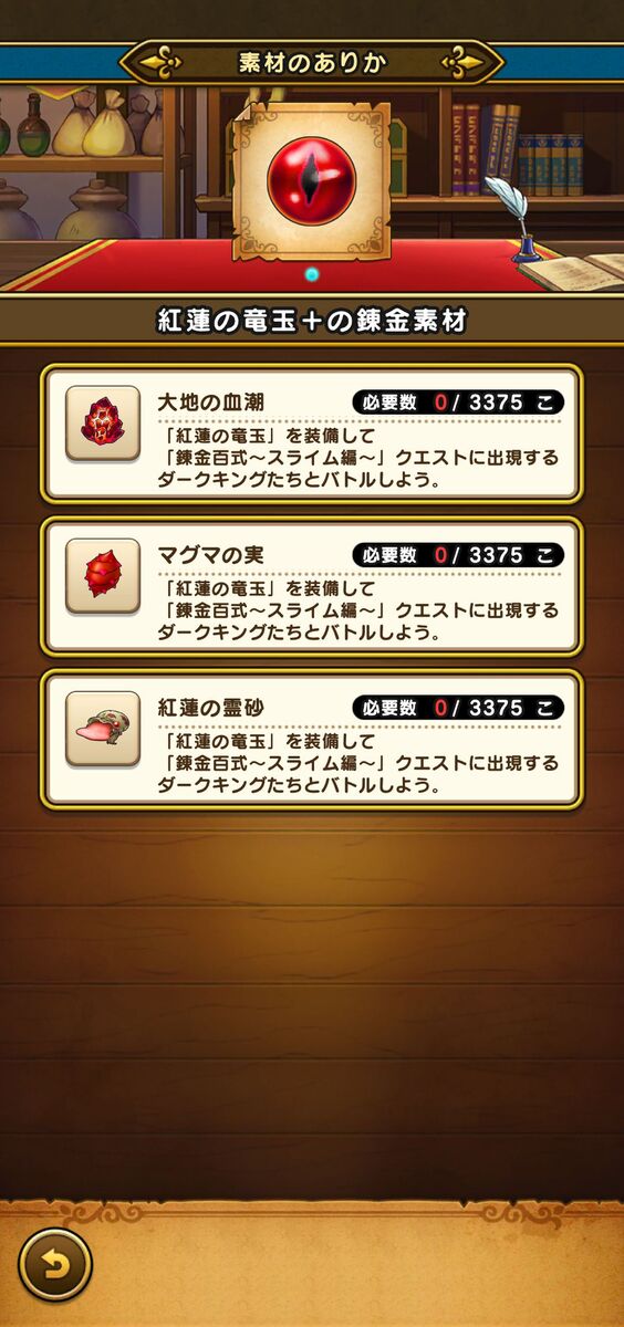 まずは常設のイベントクエスト「錬金百式~スライム編~」を受注しよう。そのまま歩いていると、対象アクセサリーの錬金レシピが見つかるので回収。今回のアクセサリーはジバリア属性のダメージをアップする「紅蓮の竜玉」だ。