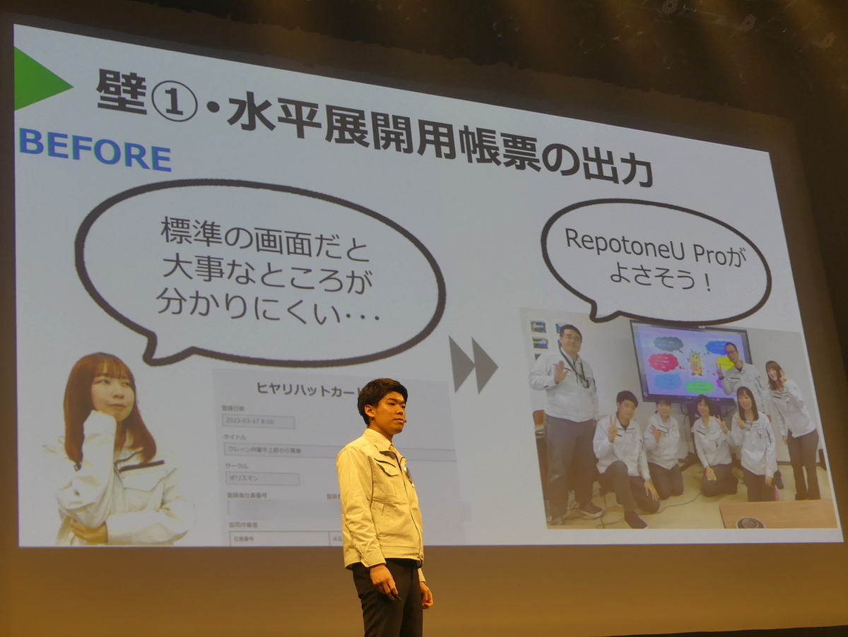 ヒヤリハットカードは、もともと紙ベースだったため、監督者が一読した後は特にフィードバックもなかった。水平展開を前提に作成したkintoneのヒヤリハットカードも、標準画面だと大事なところがわかりにくいという弱点があった。桜井氏がkintone喫茶で聞いたのは、これを解決できる「RepotoneU Pro」(ソウルウェア)というプラグイン。これにより、「事例共有作成」というボタンを押すだけで、共有用の帳票を作れるようになった。