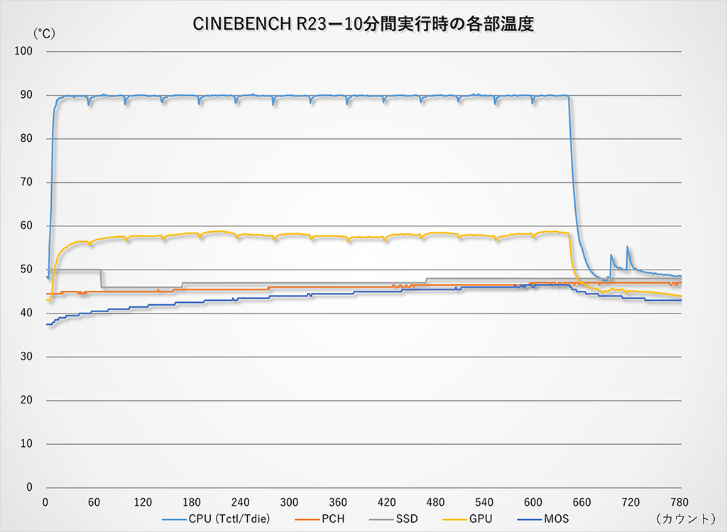 まずはCPU負荷中心のCINEBENCH R23。今回、組み合わせた簡易水冷CPUクーラーの調子が悪く、制御を行なうUSB接続が一定周期で切断・接続を繰り返す状態で、CPU温度はあまり参考にならない点に注意いただきたい。室温は27℃だった。肝心のMOSFET温度はスタート時37.5℃で最大46.5℃。ベンチマーク負荷が抜けた後は43℃まで低下した。バラック状態かつケースファンなしでの計測だが、VRM温度の上昇はゆるやかで、負荷が抜けた後はすぐに2℃ほど下がり、あとはゆるやかに冷却されていく印象だ。通電状態のままアイドルを続けると38.5±1℃あたりに落ち着いた。この結果から、VRMの発熱もまずまず小さく(変換効率もよい)抑えられ、ヒートシンクからの放熱も信頼に足ると考えてよいだろう。