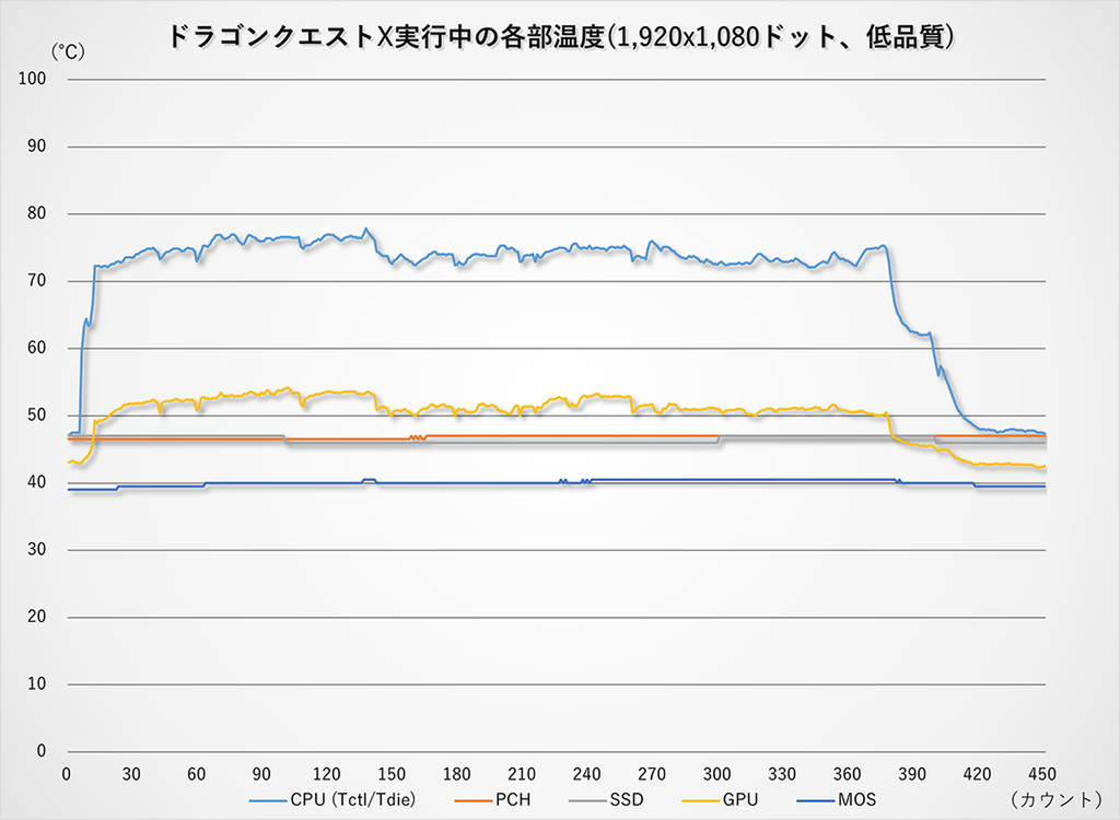 もうひとつドラゴンクエストX ベンチマークソフト。設定は1920×1080ドット、低品質。こちらはゲームベンチマークで主に使われるのはGPUだが、フレームレートが高い分、CPUもそれなりに負荷がかかる。こちらはスタート時39℃で1分後には40℃に達した。ただしそこからは大きな温度上昇はなく最大でも40.5℃だった。
