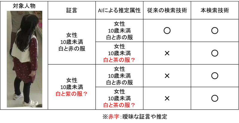 例えば、服装の色について記憶が誤っている場合や、光の加減によりAIによる推定が事実と異なる場合など、検索条件の一部に該当しないものがあっても候補から排除することなく対象人物を見つけることができるとしている。