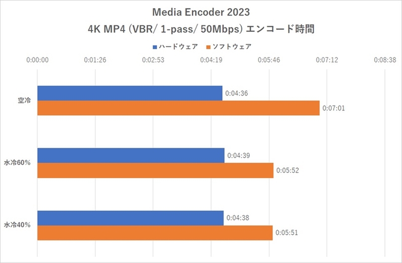 ソフトウェアは空冷だと遅くなるのはこれまでの観測結果と合致するが、ハードウェアエンコードはは水冷化するとむしろ遅くなる傾向があることに驚く。実はこれは理由があるが、これは後ほど解説するとしよう。ただハードウェアで空冷が速いといっても本体は熱を持つしファンノイズも騒々しいため、安定運用を狙うのであれば水冷ユニットの利用を強くオススメしたい。