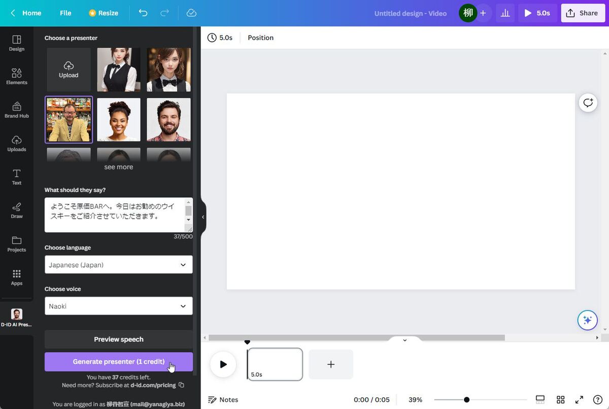 筆者は、画像に映っている人物に任意のテキストを喋らせる動画を作成できる「Creative Reality Studio」(D-ID)というサービスを利用しているのだが、なんとCanvaから利用できるようになっている。Canvaの言語設定を英語にしなければ、メニューに出てこないのでしばらく気が付かなった。
