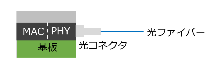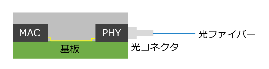 MACはデジタル電気信号の形でイーサネットの入出力を行ない、これをアナログに変換した上で光信号の形で入出力するのがPHYである。この2つは基板上でつながることになるので、ここの信号の高速化のためにガラス基板を使おう、という話である。