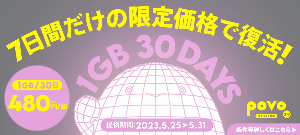 KDDIのオンライン専用プラン「povo2.0」は、5月25~31日の期間限定で「データ追加1GB(30日間)」を提供することを発表した。料金は1回480円。