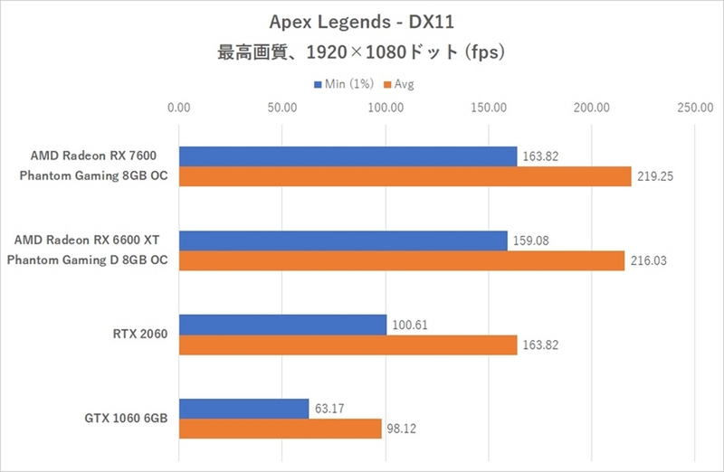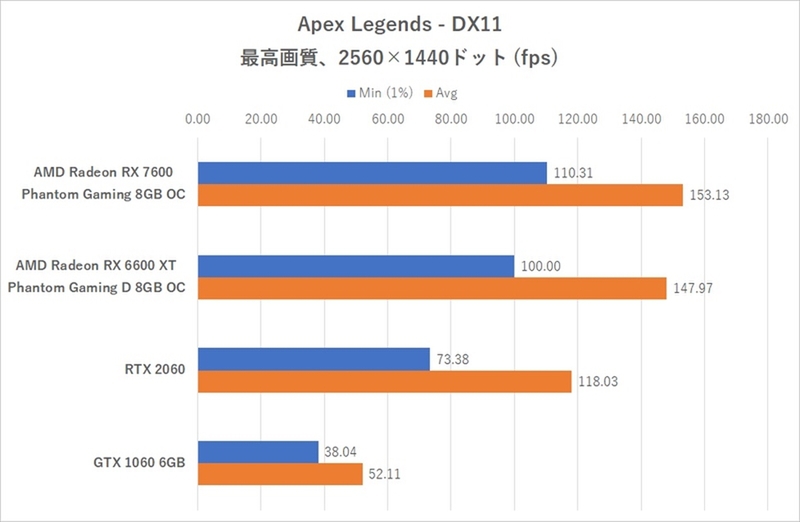 eスポーツ系FPSばかりが続くが「Apex Legends」も試しておきたいところ。画質は全項目最大になるよう設定し、起動オプションで144fps制限を解除(+fps_max unlimited)。リニューアルされた射撃訓練場で一定の動作をした際のフレームレートを計測した。