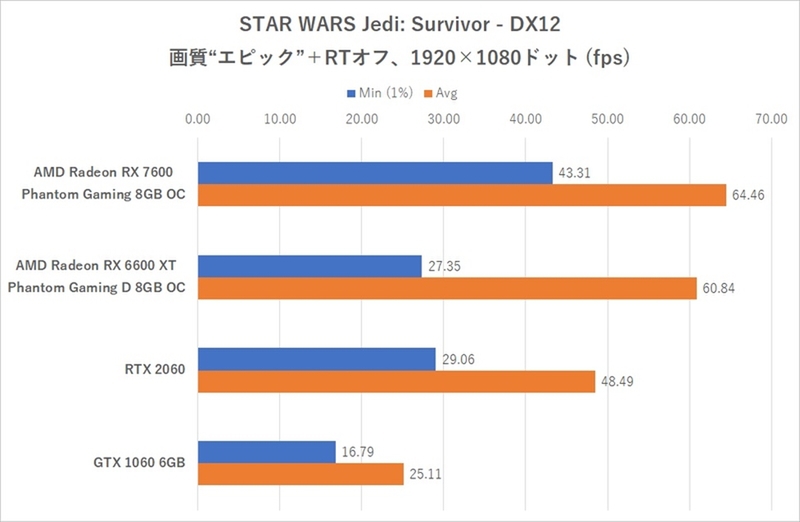 FPS系はこの位にして「STAR WARS Jedi: Survivor」でチェックしておこう。画質は“エピック”とし、レイトレーシングは“オフ”としている。新規ゲームを開始して最初の連行シーンにおけるフレームレートを計測した。