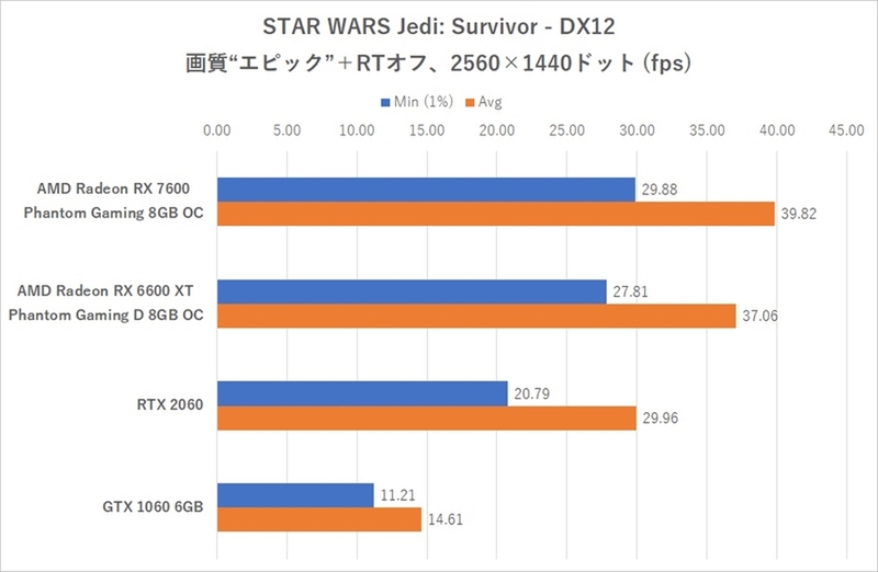 RX 7600のファーストレビュー記事ではレイトレーシングオンで検証したが、オフにして検証してもどのGPUも最低フレームレートの落ち込みがちょっと大きめ。画質エピック設定であれば、AMD Radeon RX 7600 Phantom Gaming 8GB OCはちょっとカク付くものの描き込まれたグラフィックをじっくり堪能するには最適。ガチバトル路線のプレイヤーなら、画質を1ないし2段落とすことを考えてみよう。WQHDや4Kで試すなら、同社のRX 7900 XTやRX 7900 XTXあたりのカードを狙うのが吉だ。