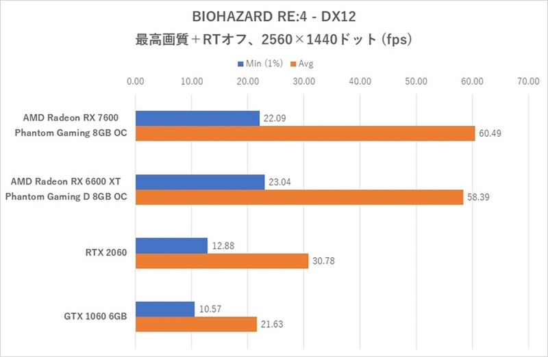 レイトレーシングを使っていないのでGTX 1060 6GBも参戦しているが、もう最新ゲームの最高画質設定には厳しすぎる性能といえる。その点AMD Radeon RX 7600 Phantom Gaming 8GB OCはフルHDなら平均80fps以上出るが時々カクつくのは覚悟しておこう。これはBIOHAZARD RE:4のVRAM消費量があまりにも多いためだが、設定画面と相談してVRAM消費量の警告が出ない程度に下げるとよいだろう。