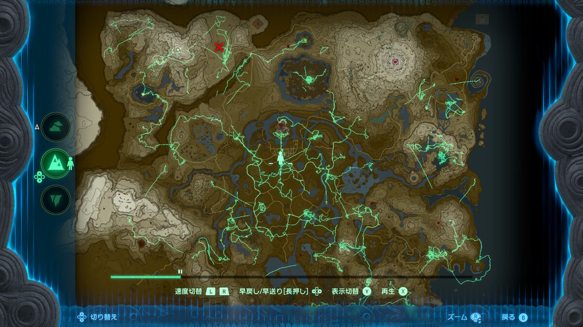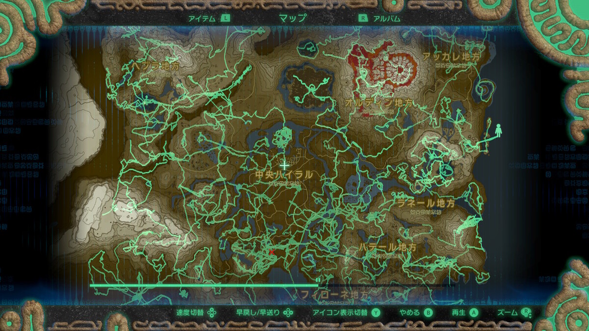 前作『ブレワイ』(上)と『ティアキン』(下)の地図(祠のネタバレを防ぐため足跡モードで撮影)。大まかな地形は同じだが、実際に探索すると新たな発見も多い。まだまだ『ティアキン』は未踏の地も多いことがわかる