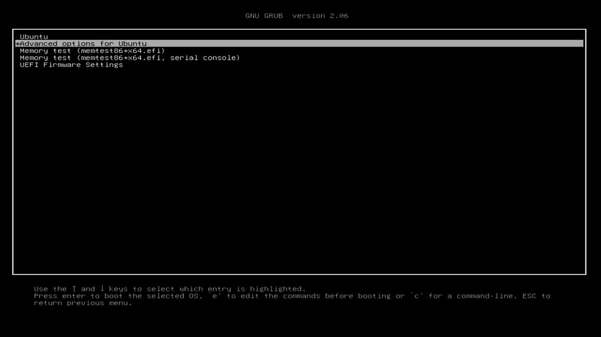 まずはインストール時と同様、Nouveauドライバーを回避してUbuntuを起動する。Nouveauドライバーを回避する手段はいくつかあると思うが、「Advanced options for Ubuntu」で起動する方法が簡単だ。Ubuntuが起動する時にEscキーを1回押すとGRUBの起動メニューが表示されるので、そこから選べばOKだ。