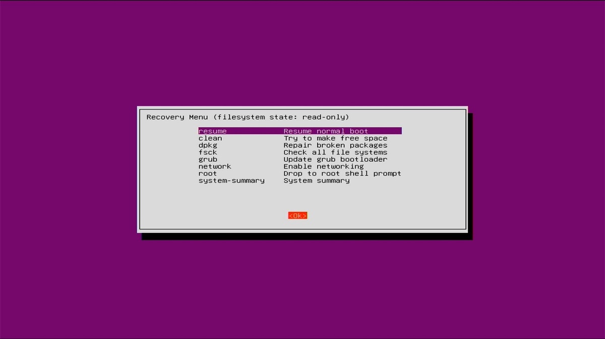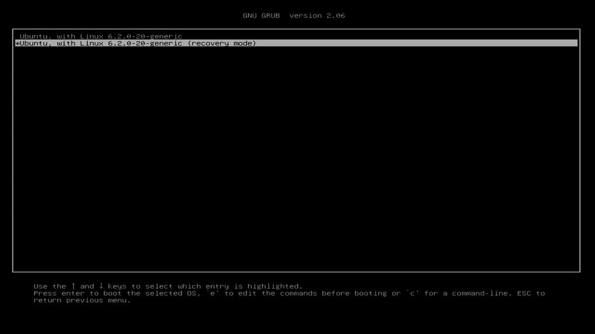 すると次のメニューが表示されるので、「Ubuntu,~(recovery mode)」のほうを選んでEnterキーを押そう。