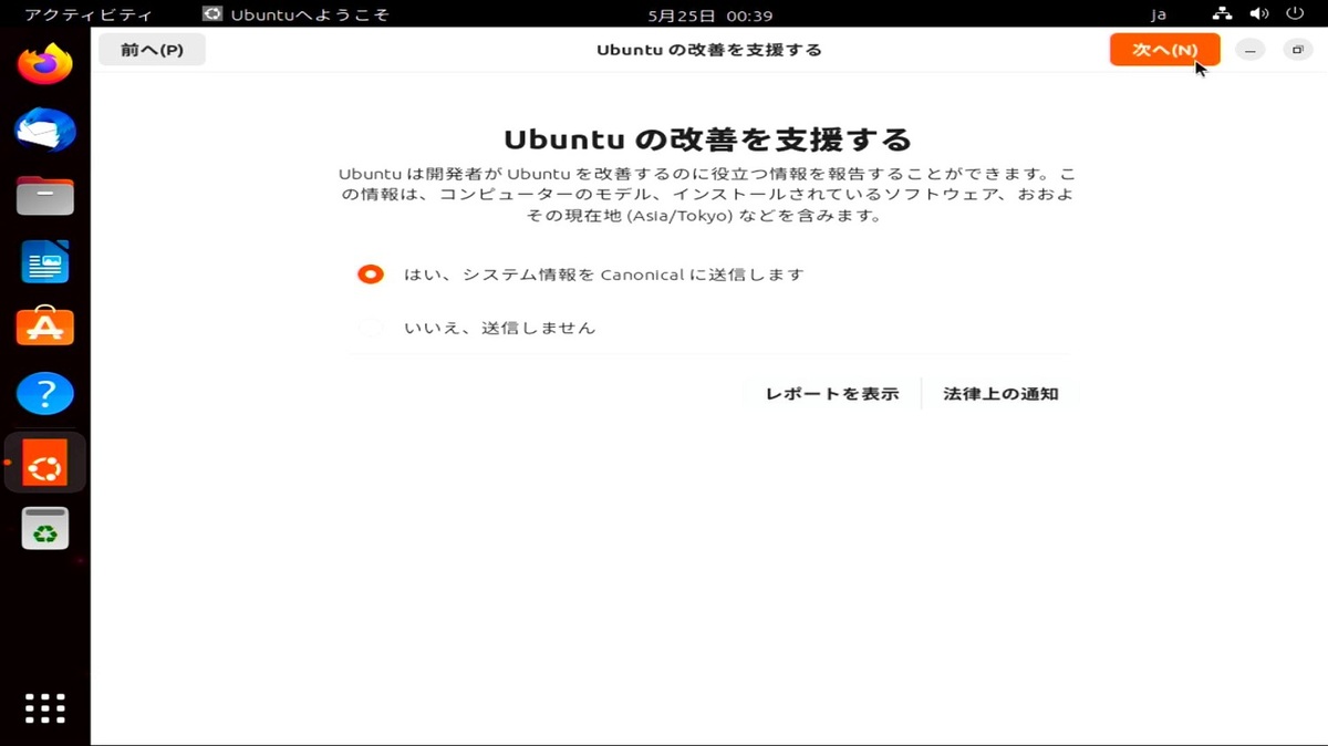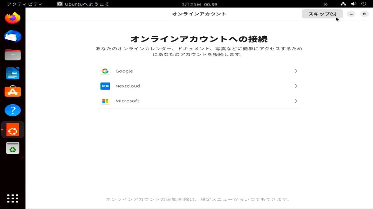 するとインストール時と同様に低解像度とはいえ、Ubuntuが起動するはずだ。ここで初回起動時に表示される「オンラインアカウントへの接続」という設定が始まるが、スキップしてしまってかまわない。