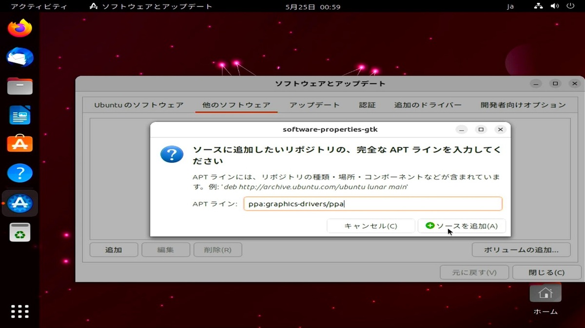 これらの設定が終わると、Ubuntuが使えるようになる。早速ドライバーを変更しよう。左下のアイコンから「ソフトウェアとアップデート」というソフトを起動。「他のソフトウェア」タブを開き、「追加」ボタンをクリックする。ウィンドウが表示されるのでAPTラインに「ppa:graphics-drivers/ppa」と入力し、「ソースを追加」ボタンを押す。