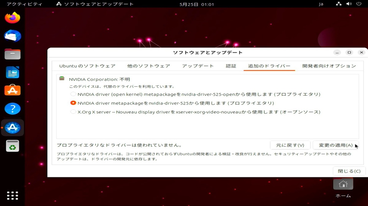 この「追加のドライバー」タブには3つほどドライバーが並んでいる。「nvidia-driver-525」と書かれているものを選択し、「変更の適用」をクリックすると変更作業が始まるので終わるまで待とう。「再起動」というボタンが表示されたら、PCを再起動する。これでようやく起動に失敗することなく、Ubuntuが立ち上がるはずだ。