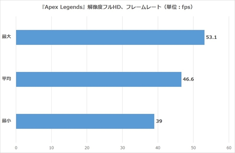 ではお待ちかね、実ゲームのフレームレート計測も見たいきたい。最初は根強い人気のFPS『Apex Legends』の計測結果だ。画質設定はデフォルトのまま、解像度は1920×1080ドットにして、CapframeXにて計測した。最小値は99パーセンタイル(P1)の数値を参照している。