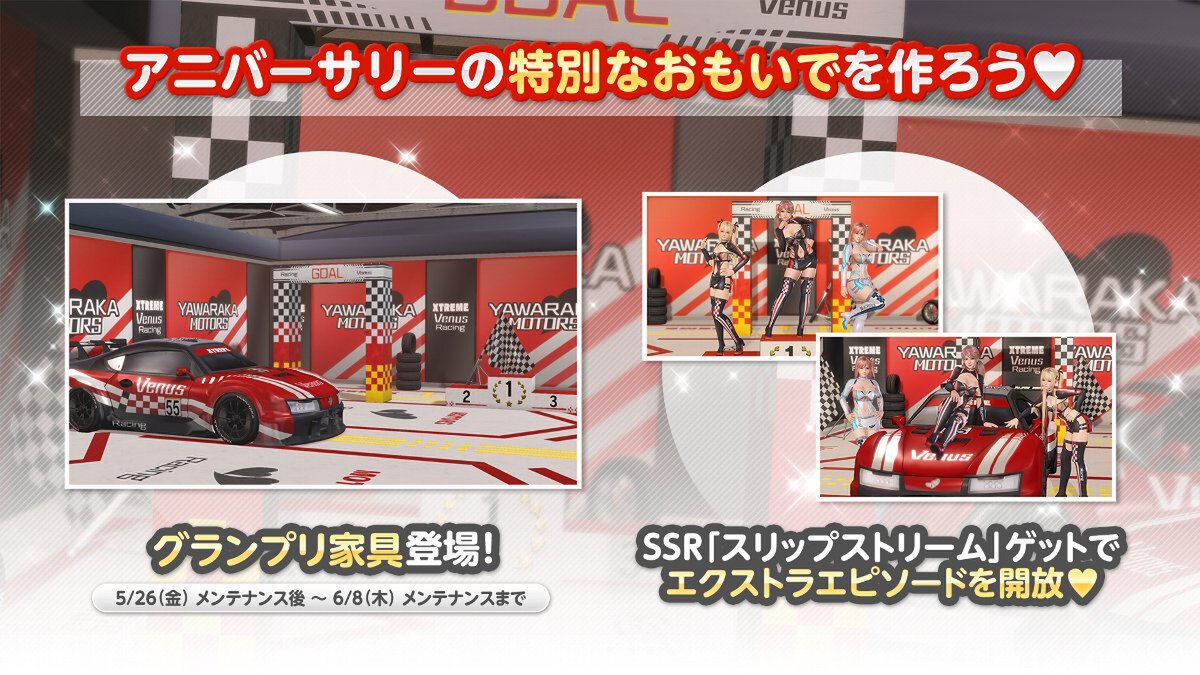 SSR水着「スリップストリーム」の入手を条件とした期間限定ミッションをクリアすると、入手した女の子専用の「大道具『レーシングカー』ボンネットに座る」が入手できる。さらに今年の4月1日のエイプリルフール企画で登場した「ブイブイカスタム」カラーリングの「大道具『ブイブイカスタム』ボンネットに座る」も入手可能だ。