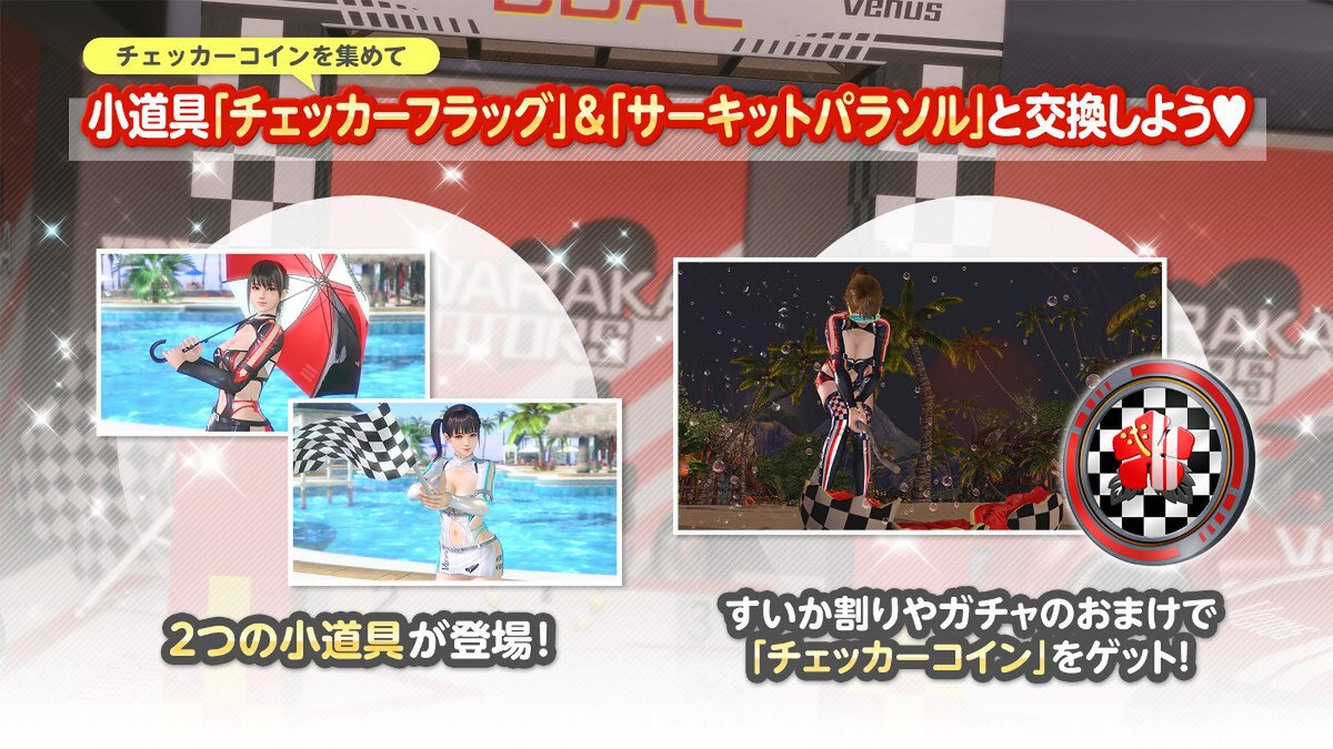 新イベント「5.5Year Anniversary~GoGo!ヴィーナスGP~」が開始。「スイカ割り」やアニバーサリーコーデガチャのおまけで入手できる「チェッカーコイン」を集めて、新規追加の「小道具『チェッカーフラッグ』振る」と「小道具『サーキットパラソル』傘を差す」を手に入れよう。