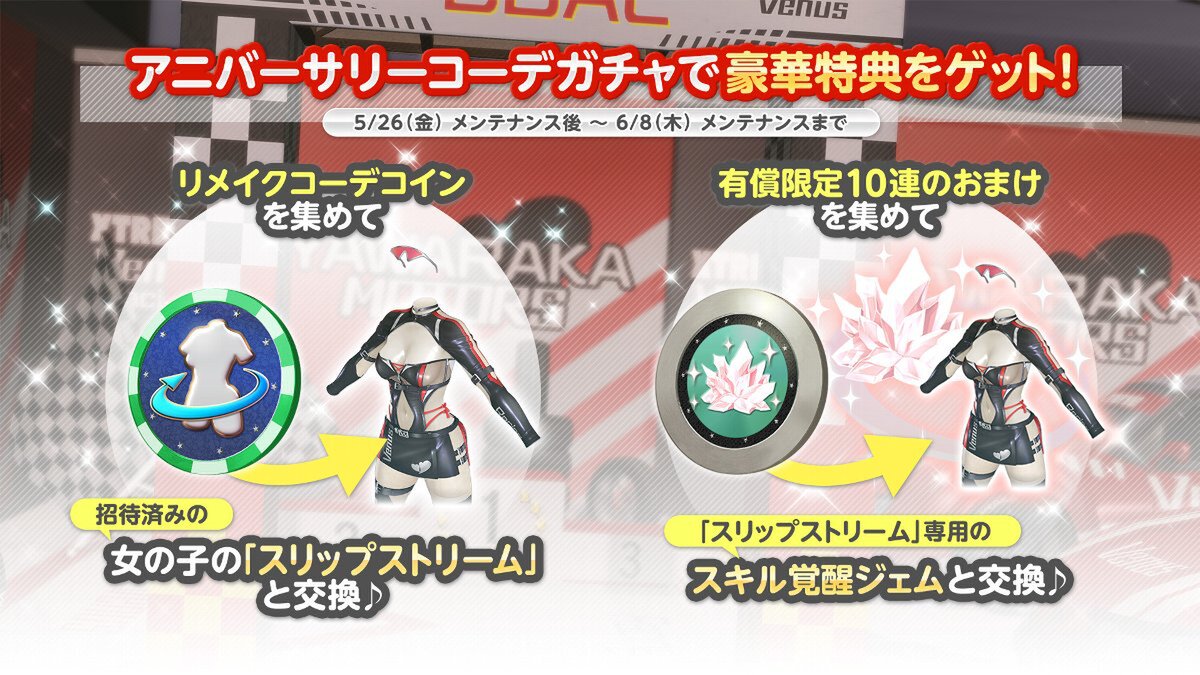 5.5周年アニバーサリーコーデが手に入るガチャが登場。新SSR水着「スリップストリーム」の出現確率はヴィーナスガチャの約3倍の3.3%となっている。期間中1日1回(最大7日間)、アニバーサリーコーデガチャ専用の10連ガチャチケットがもらえるログインボーナスも開催。