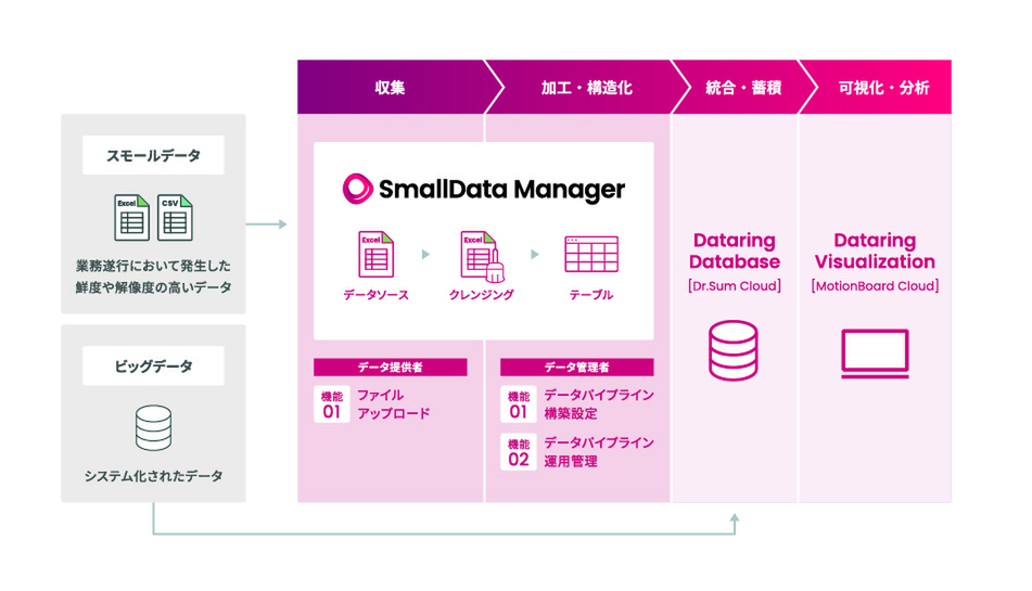 Dataring SmallData Managerは、既に利用しているシステムや業務の運用を変更せずに、スモールデータを収集のプロセスを簡易化し、バリデーション処理やクレンジング処理を自動実行する。Dataringの分析基盤に投入することで、システム化のコスト削減だけではなく、基幹システムや業務システムで生成される実績値等のデータと、計画値等の未来のデータを組み合わせたデータ分析環境を実現するという。