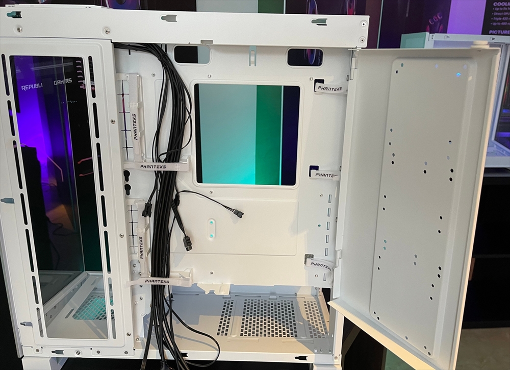 裏配線部分も、カバーによってスペースが細かく分かれている形ではない。とはいえ、ケーブルマネジメントがしやすいようにケーブルタイなどがしっかりと配置されてているのは嬉しい。
