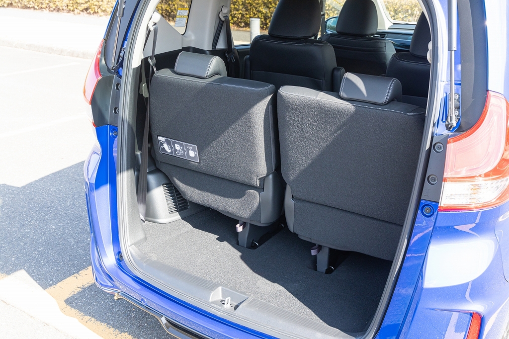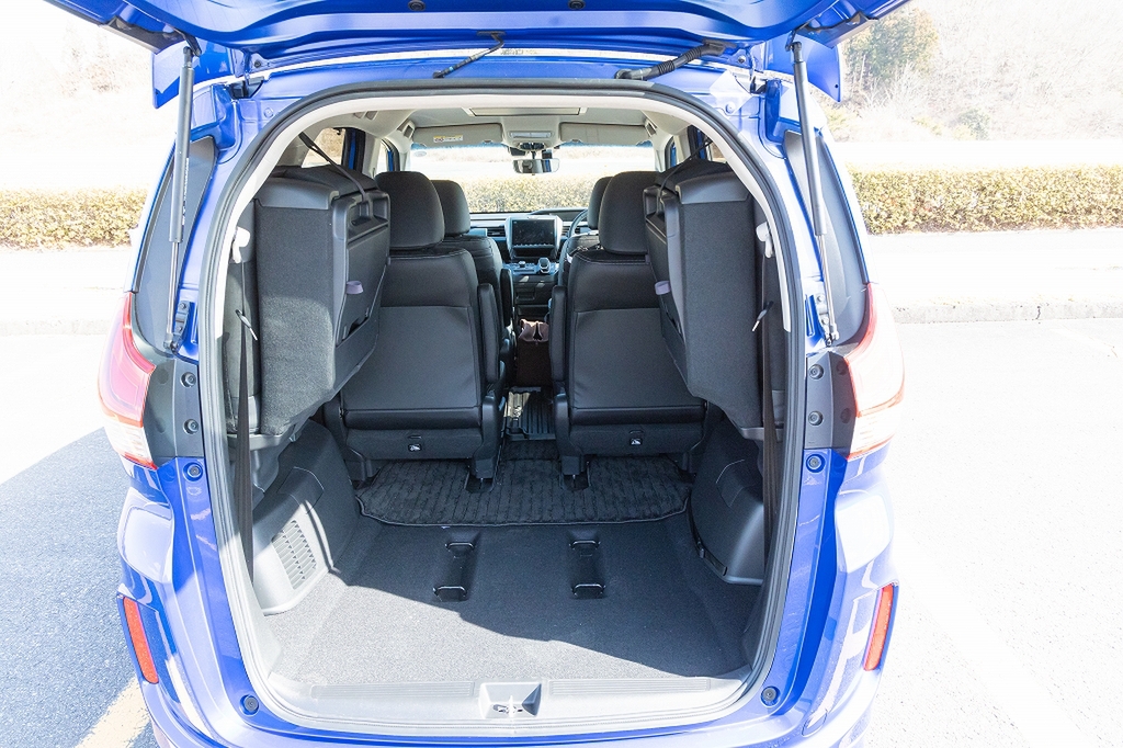 まずはバックドアを開けてみましょう。3列シートが出ている状態の荷室はN-BOXと同程度という印象。ならばと3列目シートをたたもうとすると、これがステップワゴンのような床下収納ではなく、側面の壁にペタンと倒すタイプで、思ったよりも入らないかも、と感じたり。ただ、床が相当低いので、重たい荷物を載せるのはラクそうです。