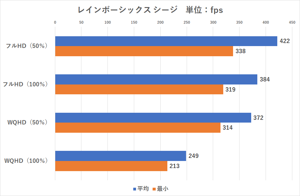 レインボーシックス シージの設定は、APIがVulkan、画質は「最高」プリセットを選び、スケーリングはデフォルトの50%と100%で内蔵ベンチマークを実行。結果、WQHDの100%設定でも、ハイリフレッシュレート仕様のゲーミングディスプレーを活かせる成績だった。軽量タイトルだと、ここまで快適になる。