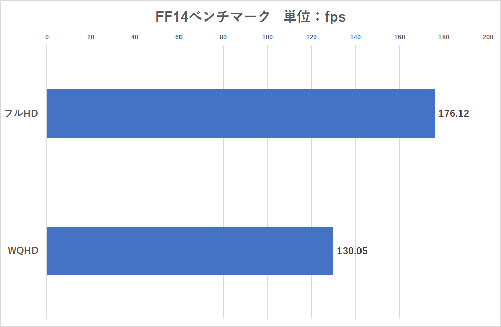 中量級の負荷になるFF14ベンチマークは「最高画質」でテスト。WQHDでも「非常に快適」という評価で、これからFF14を始めたい人でも安心のスコアーと言える。なお、レポートによると平均フレームレートはWQHD時で130fps超えと、こちらも大満足の結果だ。