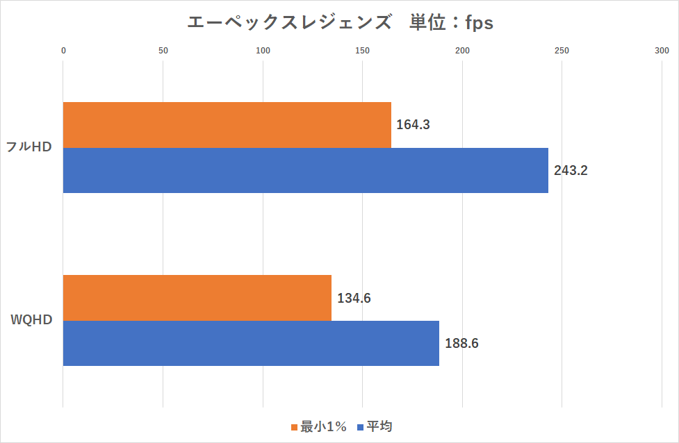 WQHDでも最小が134.6fpsと120fpsを超えているので、快適にプレイできるだろう。とはいえ、競技性の高いタイトルなのでフレームレートは高ければ高いほど有利に立てることも。物足りないと感じるプレイヤーは、画質を下げてフレームレートを補填してもいいかもしれない。