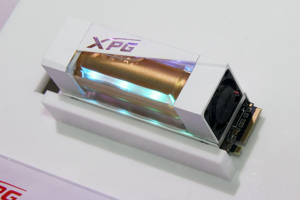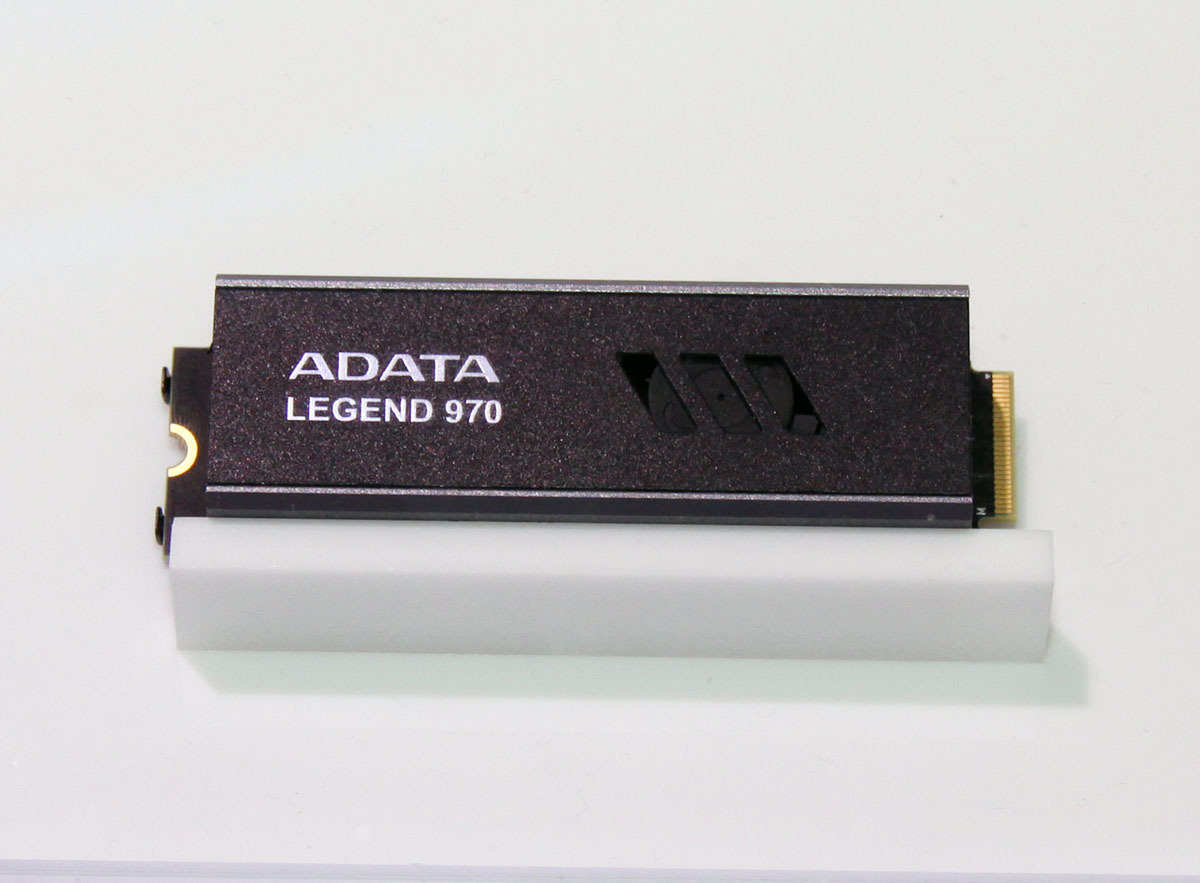 ADATAはPCIe 5.0対応SSDをもう1製品展示していた。それが「LEGEND 970」だ。コントローラーはPhison「E26」で、転送速度は読み込み書き出しともに1万MB/s。SSDにはやや厚めのクーラーが搭載されている。ここには小型のブロアーファンが内蔵されており、ファンレスモデルよりも冷却性能が18%以上優れているという。