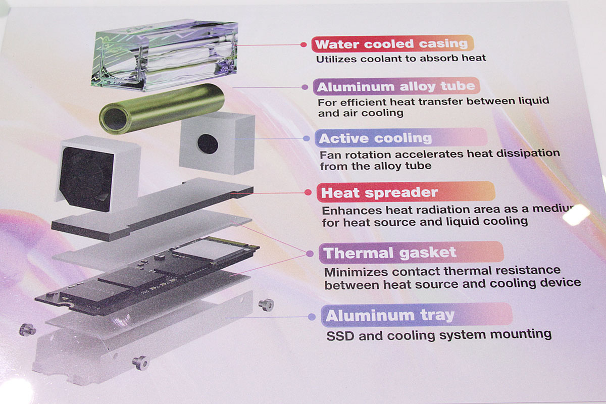 PCIe 5.0 x4インターフェース対応の液冷M.2 SSDが「Project NeonStorm」だ。コントローラーはSilicon Motion「SM2508」で、転送速度は読み込み1万4000MB/s、書き出し1万2000MB/sという性能を誇る。