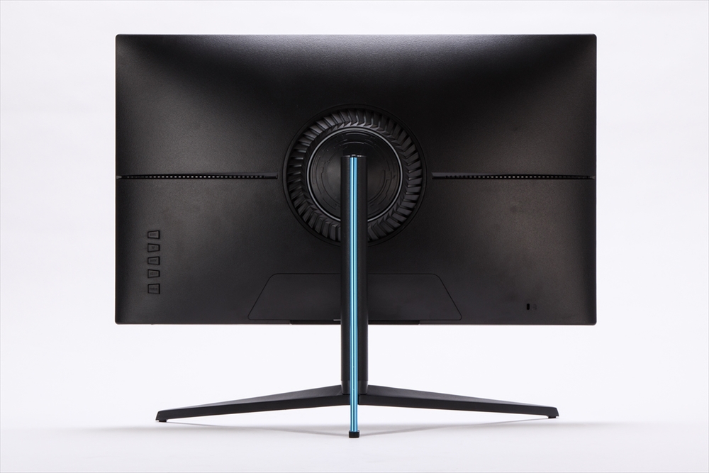 液晶パネルのサイズは実測で約562(W)×340(H)mmとコンパクト。全体は黒一色で落ち着いた雰囲気ながらも、スタンドの台座にメタリックブルーが差し色で施され印象的だ。OSD操作用のボタンは筐体右側の背面に用意。上から順に「メニューの表示」「ゲームメニュー」「輝度調節」「入力選択」「電源ボタン」の順に並ぶ。