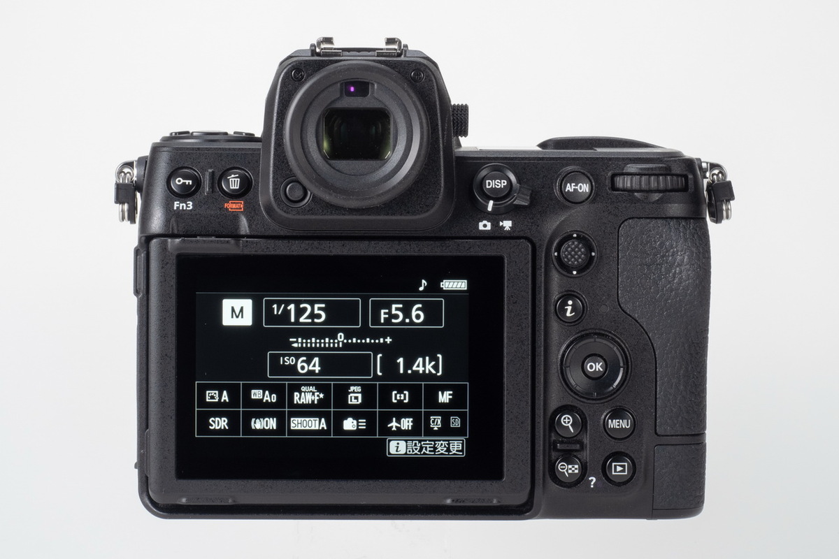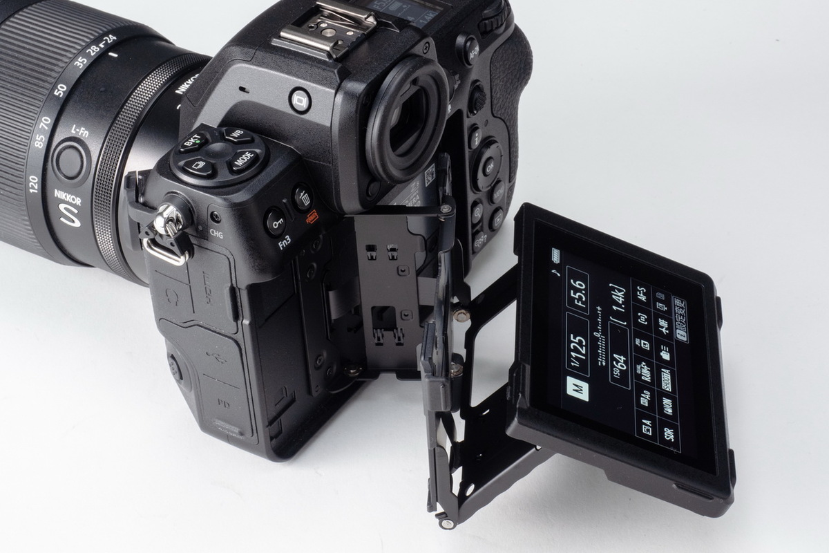 背面液晶もレンズ光軸上で可動できる縦横4軸式を採用。ただ「Z9」のときは画期的と思ったが、チルト式とフリーアングル式を組み合わせた機種も登場した現状では更なる進化を求めたいところだ。