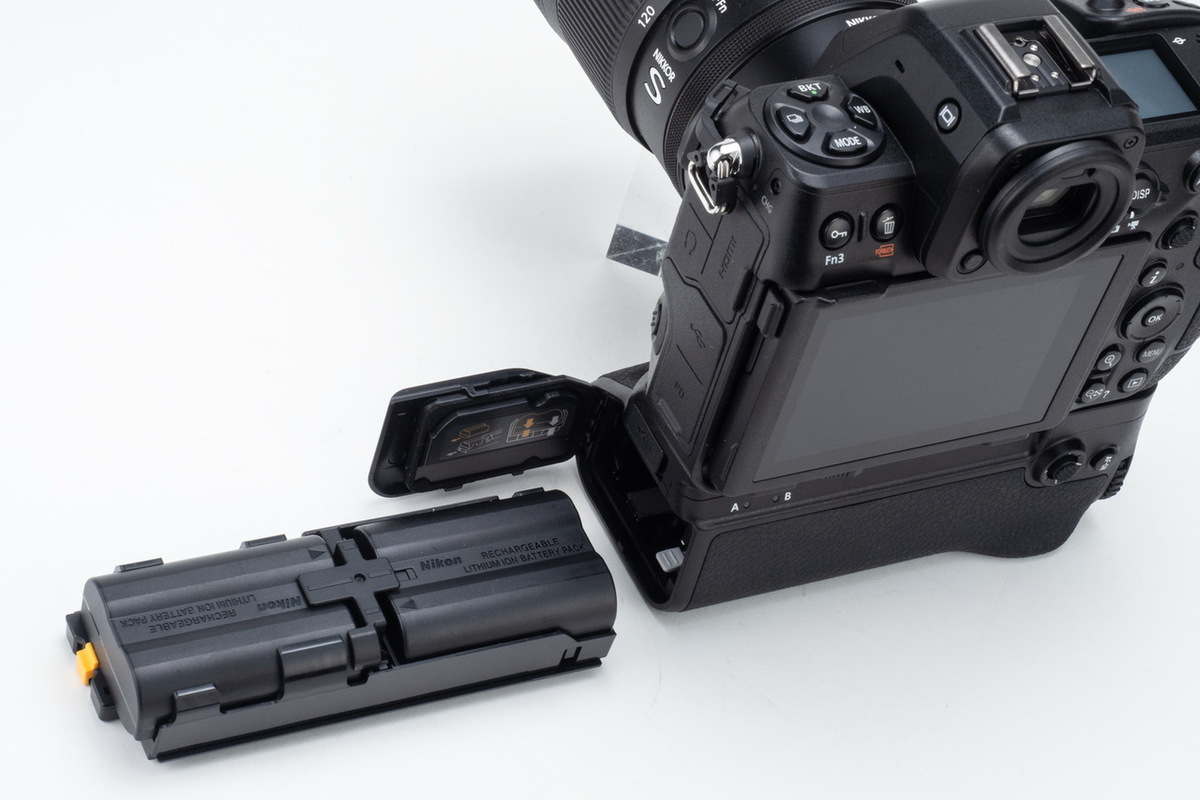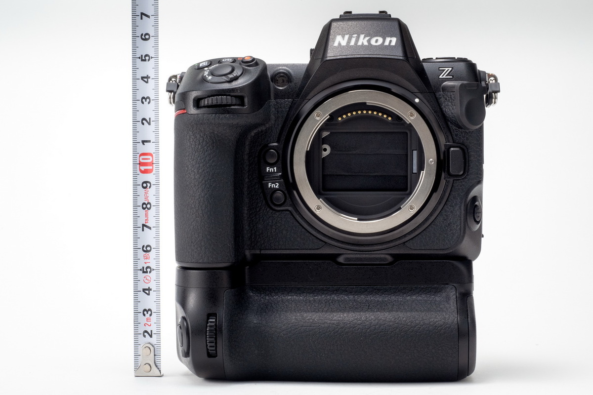 オプションとして「EN-EL15c」を2個装着できるバッテリーグリップ「MB-N12」(5万2800円)も同時に発売した。装着すると全高約175mm(実測)で重量は1365g(バッテリー2個装着時)になる。「Z9」は全高149.5mmに重量1340gなので、かなり背高になるが重さはさほど変わらない。