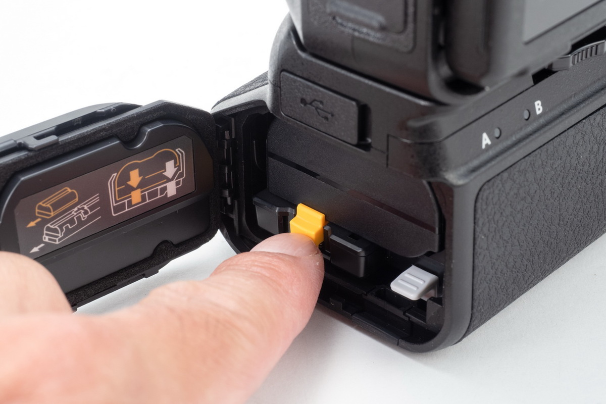 またバッテリー2個を装着した状態なら、手前のバッテリーをホットスワップで交換が可能。USB端子を備え「MB-N12」単体でバッテリーの充電もできるのが便利だ。