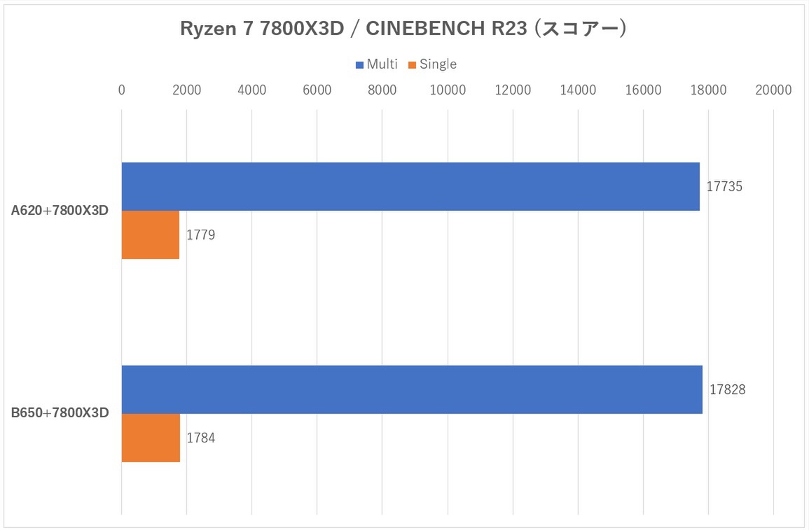 A620環境のスコアーの方が微妙にB650環境よりも低いが、この程度ならCINEBENCH R23では誤差と割り切ってよいレベルだ。このテストは1つデータをとるのに10分以上処理が続くため、ある程度CPU温度が上がったうえでのスコアーとなっている。実ゲームではCINEBENCHほどにCPUを使うことはほぼないため、A620マザーでもTDP 120WのRyzen 7 7800X3Dのフルパワーは難なく支えられると考えてよさそうだ。