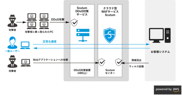 本サービスではAWS上に構築されたDDoS対策装置を経由することで、通信を監視し、ネットワークやサーバー機器へのトラフィックの過負荷を緩和することで、正常な通信の維持を図り、ユーザーのウェブサイトやサービス提供の継続を実現するという。