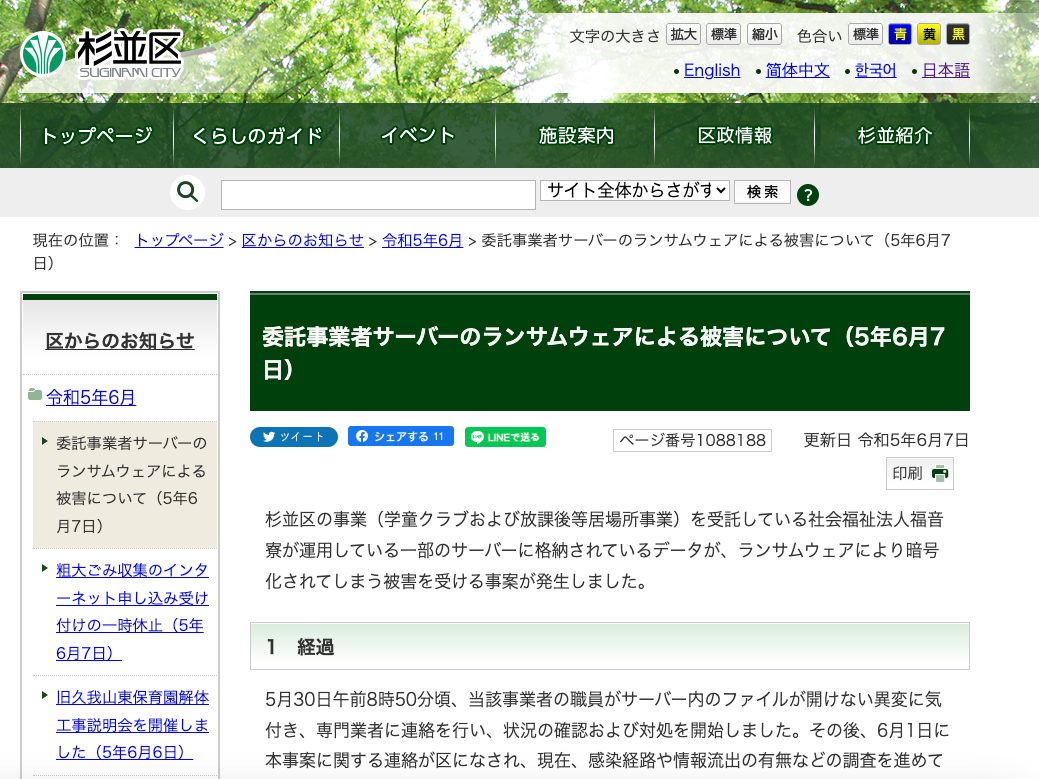 杉並区、学童クラブ利用者情報がランサムウェア被害に