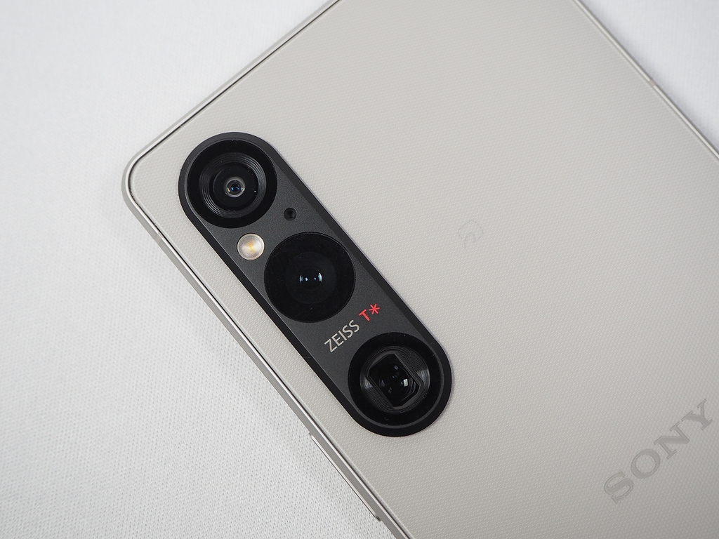 続いてカメラを確認すると、背面のメインカメラは約4800万画素/F値1.9の広角カメラと、約1200万画素/F値2.2の超広角カメラ、そして約1200万画素/F値2.3~2.8で倍率が可変する望遠カメラの3眼構成。ZEISS T*(ティースター)コーティングが施されている点は過去機種と共通している。
