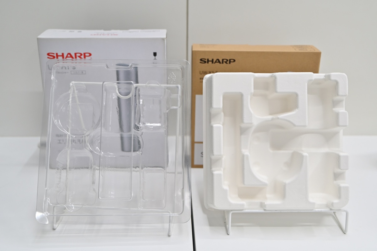シャープでは環境に配慮し、パッケージのプラスチック使用量を約94%削減。緩衝材にはサトウキビのしぼりかすを活用した素材を使用しています。