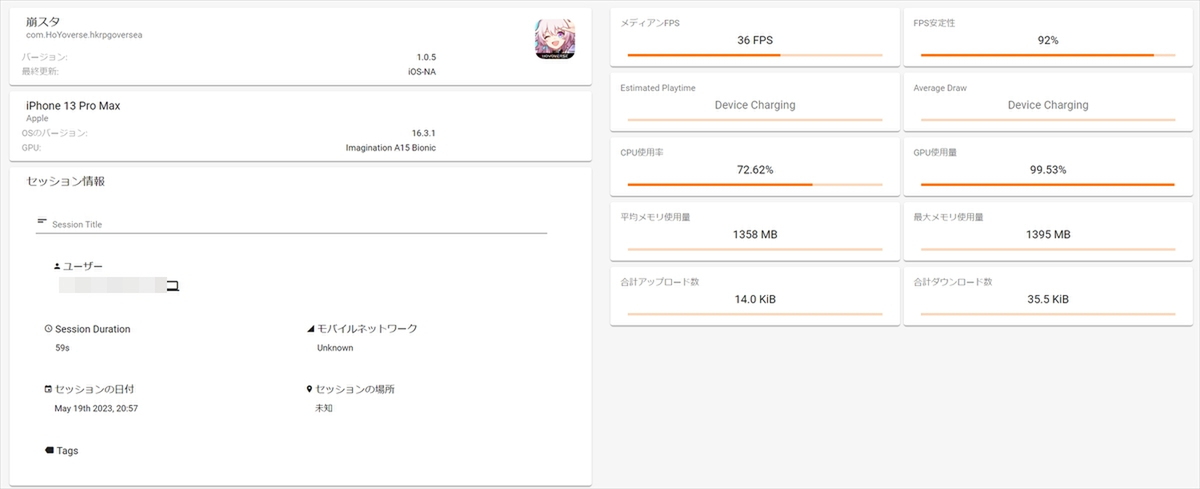 さて、「iPhone 13 Pro Max」の計測では平均フレームレートがおおむね36fpsと、最高画質設定では60fpsに届かなかった。CPU使用率は計測上72.6%前後、GPU使用率も99.53%とかなりの負荷だが、「iPhone 13 Pro Max」のスペックの高さもあり、fpsの安定性自体は高い。本作が極めて重いゲームであることが分かる結果と言っていいだろう