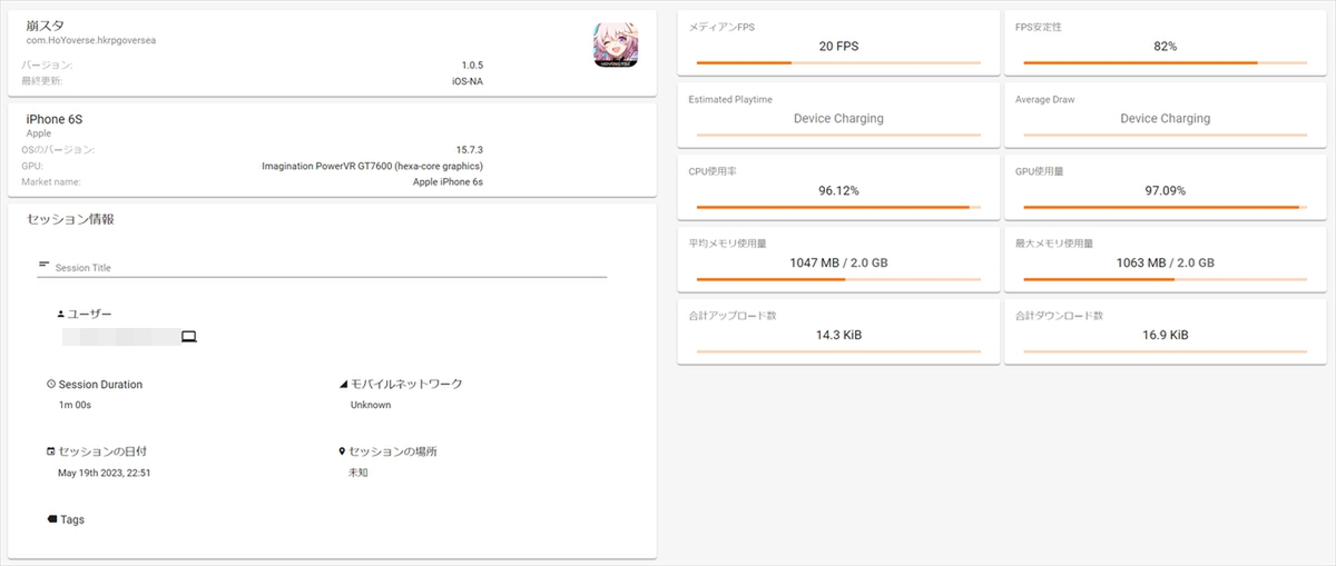 早速「iPhone 13 Pro Max」を使用し、モバイルゲームのフレームレート計測アプリ「GameBench」でゲームの動作を確認してみた。なお、計測時のゲームバージョンは1.0.5。ゲーム内マップの特定シーンで1分間移動を続けた際のフレームレートを計測している。