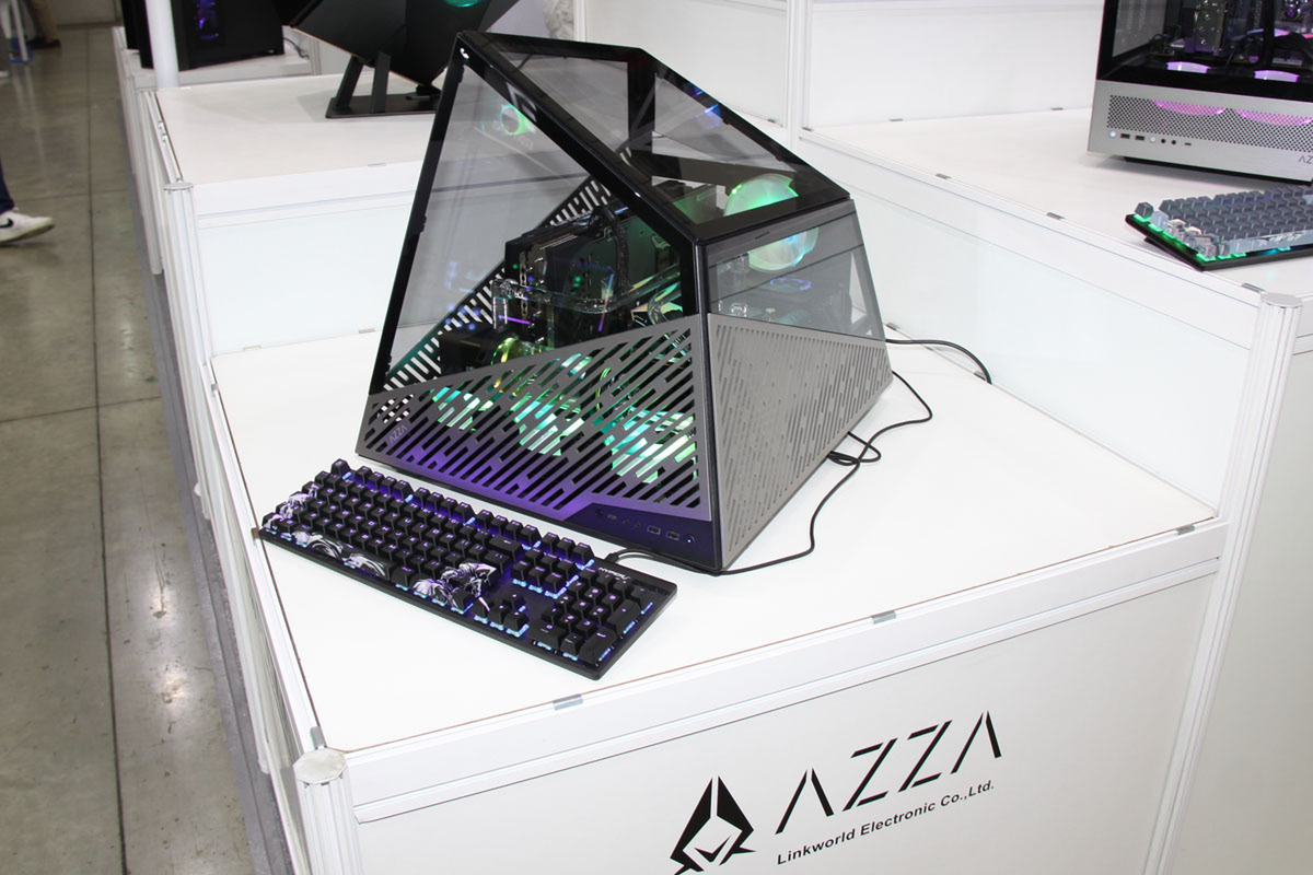 ピラミッド型ケースなど毎回奇抜な形の製品を出展するAZZA(アッツァ)。今年の新作はE-ATXケースの「Mesa 811」。PCケースは四角である必要はない、という同社の社風を地でいく形状に仕上がっている。これまで同社のPCケースはその形状ゆえ、収められるPCパーツのサイズに制限があった。そこであらゆるパーツを入れられるようにしたらこの形状になったとのこと。