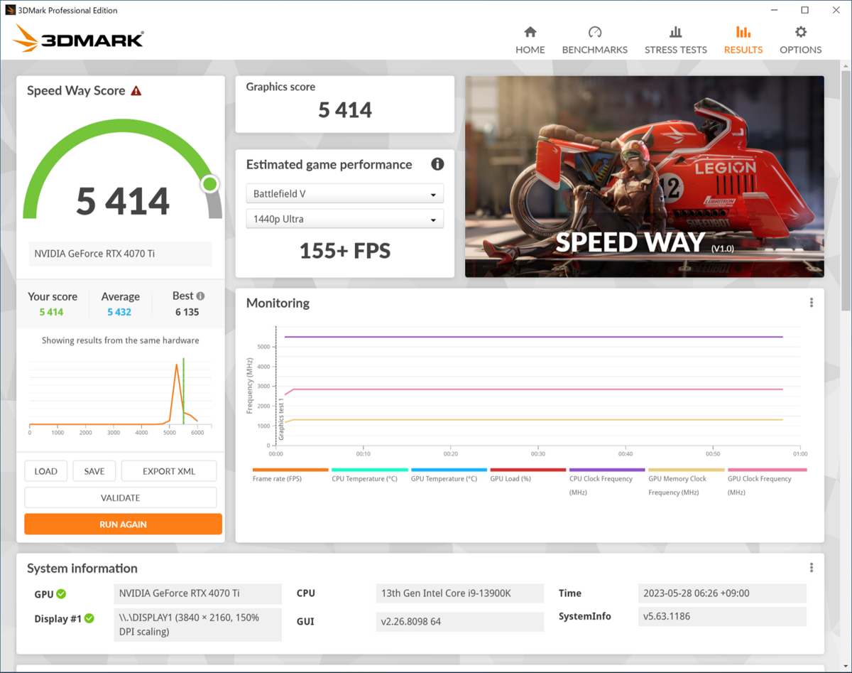 Speed Wayテストは3DMarkの中でも新しいテストで、DirectX 12 Ultimateに対応している。リアルタイムのレイトレーシング、グローバルイルミネーションなどが扱われるため、かなりビデオカードへの負荷が高く、最新世代の高性能GPUじゃないと厳しい評価になる。
