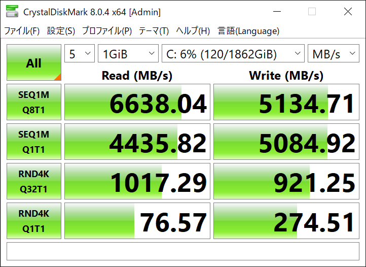 「CrystalDiskMark 8.0.4」で計測したところ、シーケンシャルリードは約6638MB/s、シーケンシャルライトは約5132MB/sと、公称値を若干上回った。この速度ならまず困るシーンはないだろう。また、近年は大容量のゲームタイトルが多い。多くのゲームを並行して楽しみたい人は、2TBモデル(標準構成に+1万560円)を選んでおいたほうがいいかもしれない。
