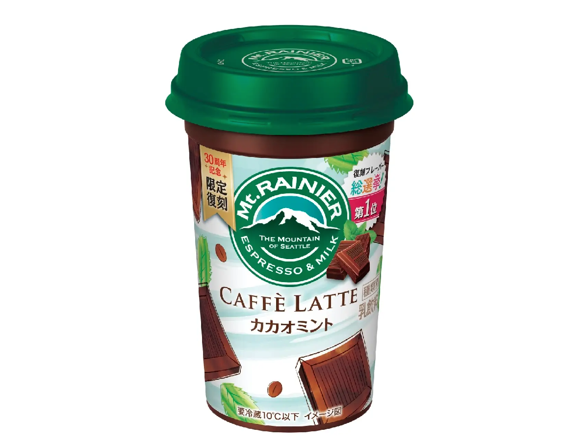 森永乳業は「マウントレーニア復刻フレーバー総選挙」にて第1位に選ばれた「マウントレーニア カフェラッテ カカオミント」(180円、税抜き)を復刻し、6月13日より全国にて期間限定発売する。