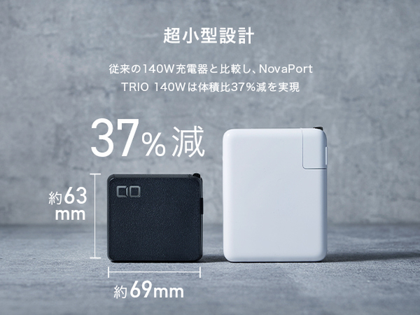 USB Type-Cポートを3つ備えており、ノートPCの3台同時充電も可能。どのポートに刺してもデバイスに合わせて、最適な出力で充電できる。3ポートを搭載しながら、従来の140W充電器と比較して体積比およそ37%のサイズダウンを実現した。本体サイズはおよそ幅63×奥行き29.5×高さ69mm。